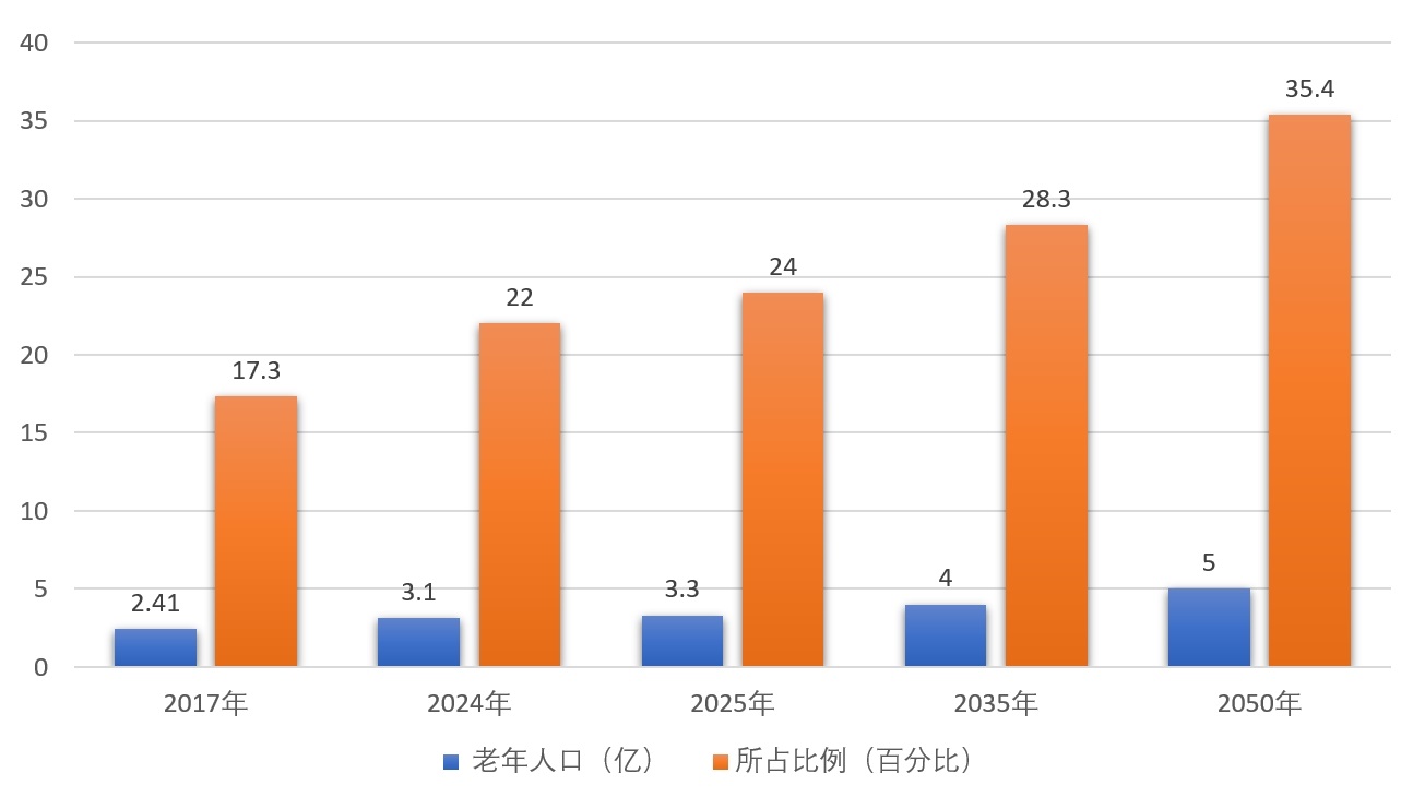 我國(guó)確立了“以居家為基礎(chǔ)、社區(qū)為依托、機(jī)構(gòu)為支撐”的養(yǎng)老產(chǎn)業(yè)框架和9073養(yǎng)老格局,90%在家中養(yǎng)老(居家養(yǎng)老);2025年1月17日,國(guó)家統(tǒng)計(jì)局發(fā)布,截至2024年底,我國(guó)60歲及以上老年人口有3.1億人,占總?cè)丝?2%,其中,65歲及以上人口超2.2億人,占15.6%。2035年左右我國(guó)60歲及以上老年人口將突破4億,在2050年前后達(dá)到頂峰,約占總?cè)丝诘?/3。那時(shí),中國(guó)將有4.8億、甚至接近5億老年人,是世界上老年人口最多的國(guó)家。養(yǎng)老服務(wù)業(yè)目前已達(dá)10萬(wàn)億市場(chǎng)規(guī)模。